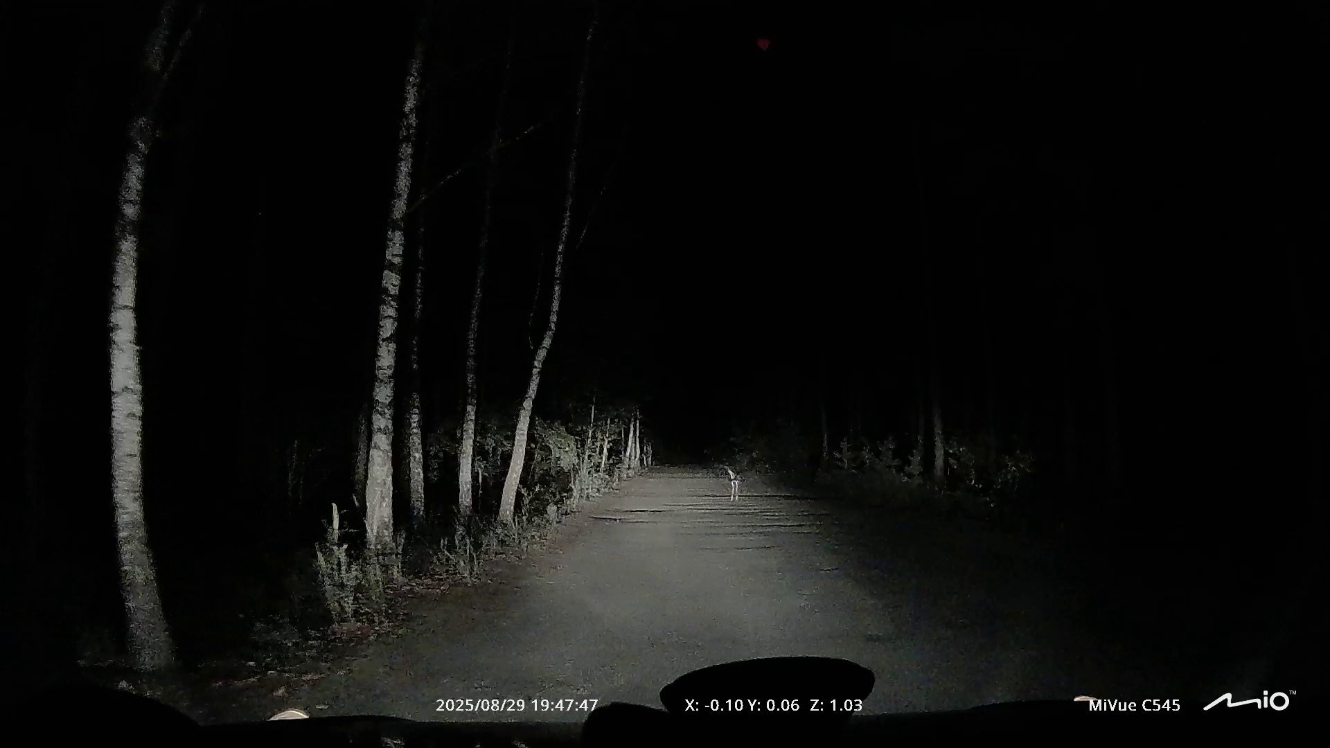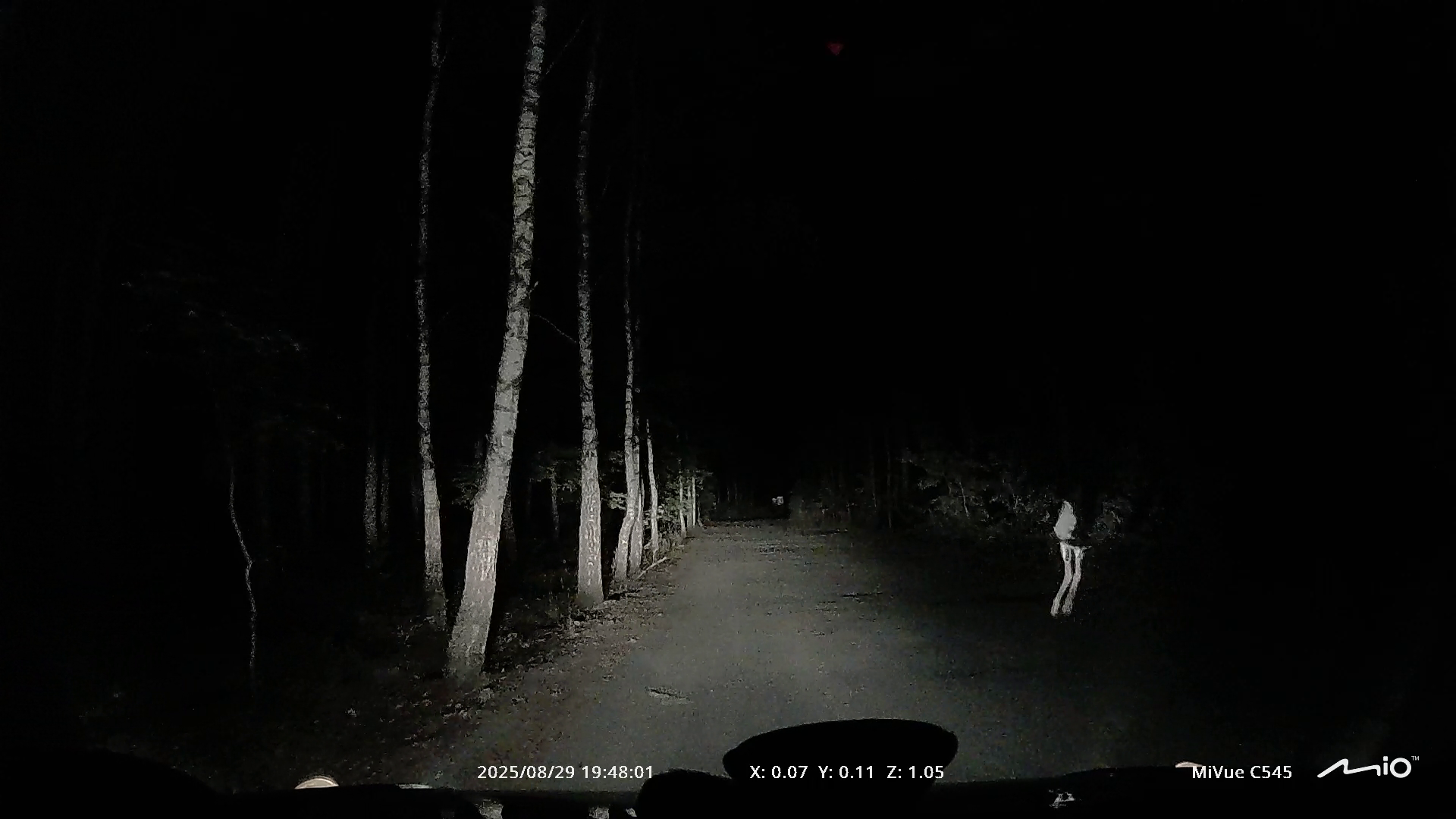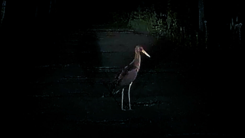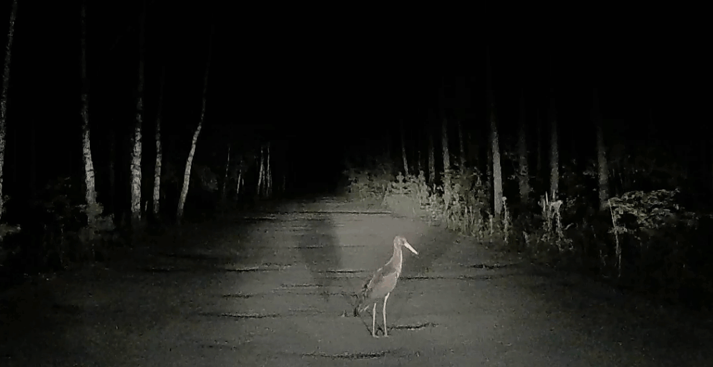 Jadąc późną porą, drogą przez las we wsi Masłońskie, natknęliśmy się na niespodziewanego gościa stojącego na jej środku. W świetle reflektorów ukazał nam się młody bocian czarny na Jurze. W przeciwieństwie do dorosłych osobników, ten nie miał jeszcze zabarwionych na czerwono dzioba i nóg, a szyja nie była jednolitego koloru.